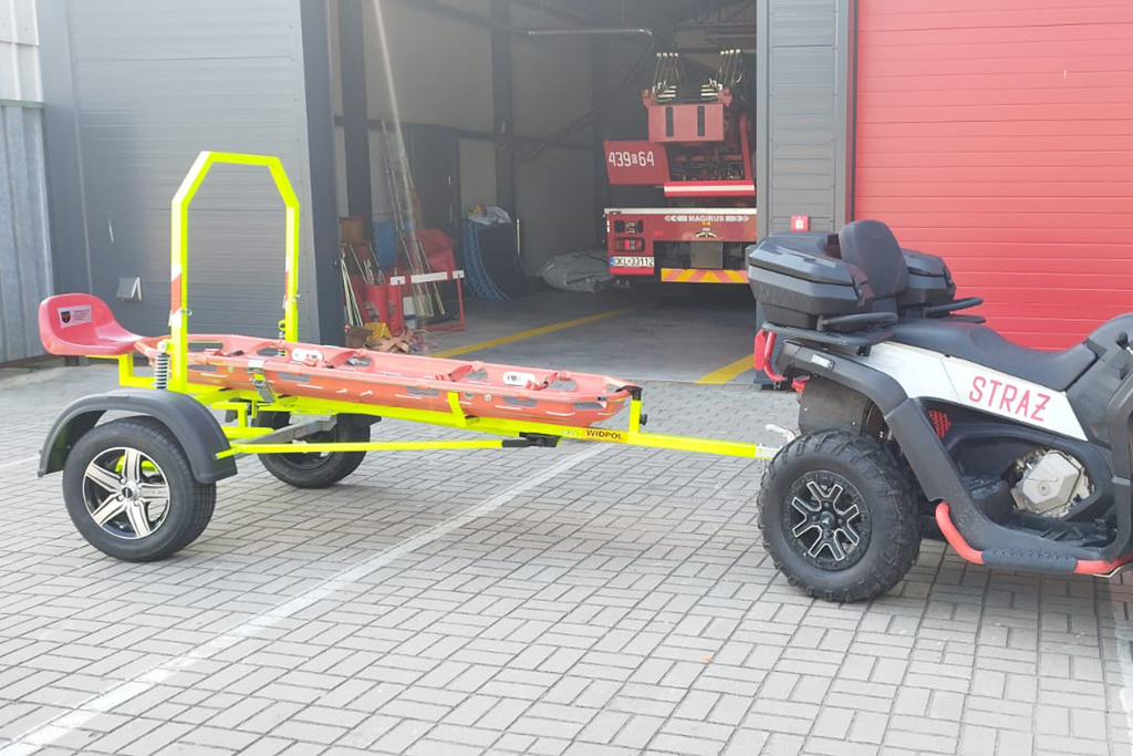 Jednoosiowa, dwukołowa przyczepka ratownicza na wyposażeniu posiada nosze dla poszkodowanego wraz z miejscem siedzącym dla ratownika. Przyczepka jest uniwersalnym rozwiązaniem i dzięki odpowiedniemu dostosowaniu będzie wspierać strażaków w dostawach specjalistycznego sprzętu oraz transportu osób poszkodowanych. Przyczepa została pomalowana proszkowo w jaskrawy kolor.