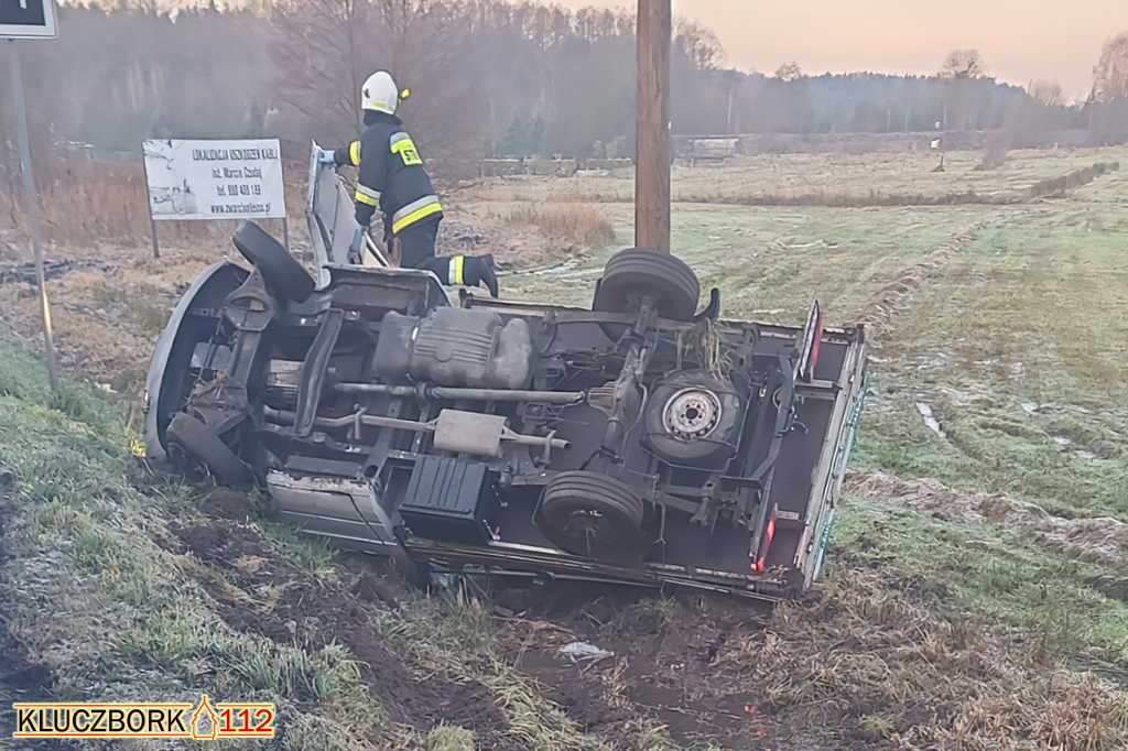 Około 100 metrów od miejsca działań służb doszło do kolejnego zdarzenia. Tym razem kierujący samochodem dostawczym Mercedes stracił panowanie nad pojazdem i wjechał do rowu. Auto zatrzymało się na boku. Na szczęście kierującemu nic się nie stało. Został on ukarany mandatem karnym w wysokości 100 złotych oraz 10 punktami za niedostosowanie prędkości do warunków na drodze.