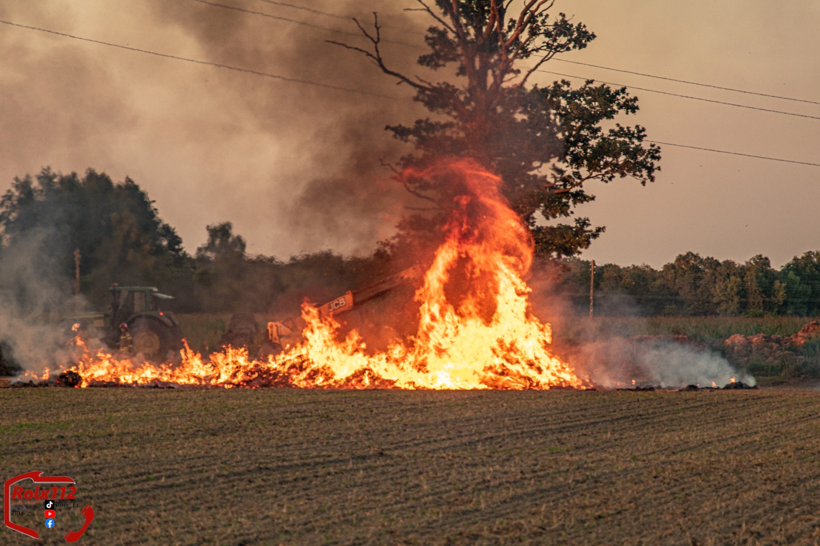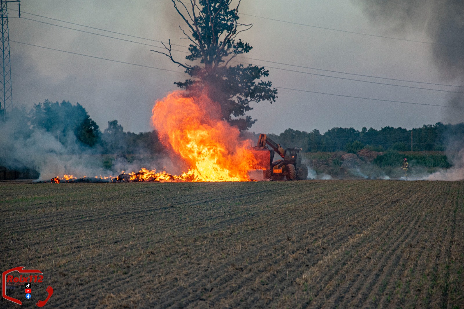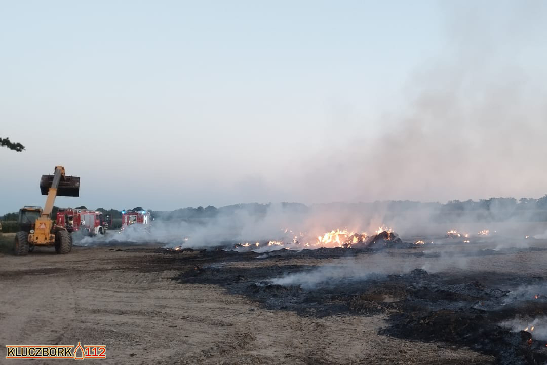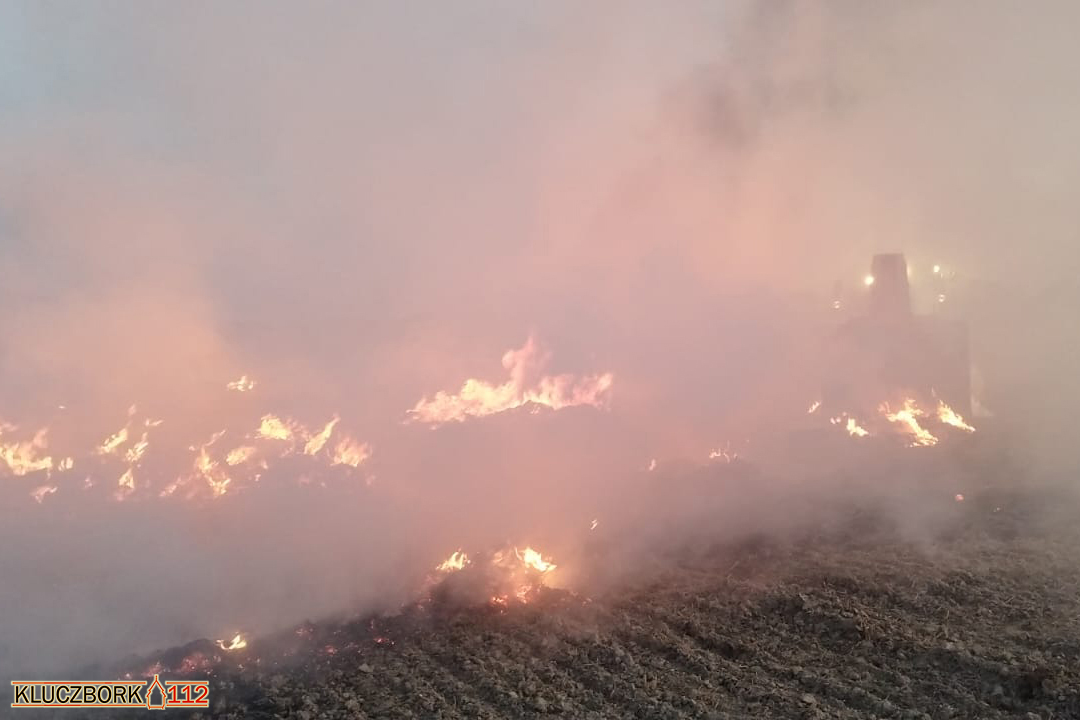 Kierujący ciągnikiem, po zjechaniu z drogi na pobliskie pole w celu rozładowania balotów, zauważył ogień w jednej z przyczep. Reagując błyskawicznie, przy pomocy ładowarki teleskopowej zrzucił bele słomy, aby powstrzymać rozprzestrzenianie się pożaru. Ten sam sprzęt został później wykorzystany podczas działań gaśniczych – ładowarka teleskopowa rozgarniała płonącą słomę, co znacząco ułatwiło strażakom skuteczne dogaszanie ogniska pożaru.