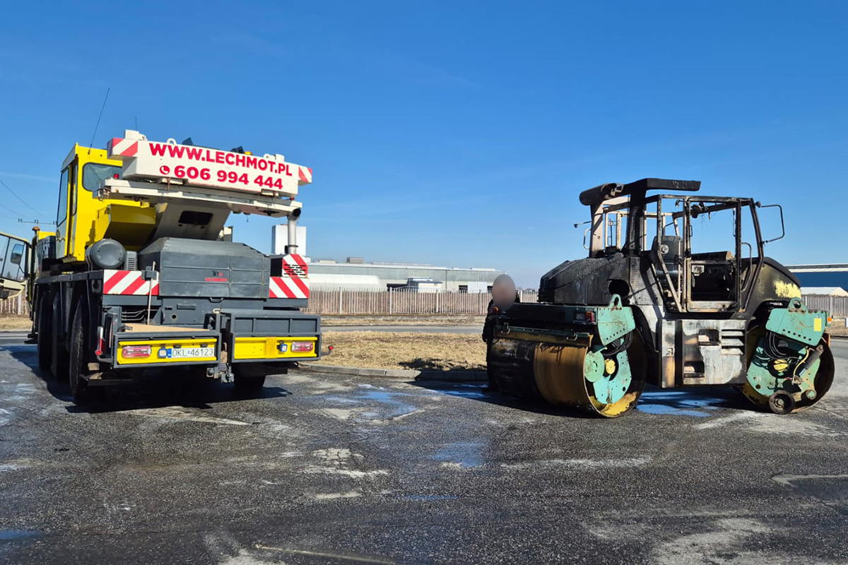 Po dojeździe zastępów straży pożarnej na miejsce zdarzenia stwierdzono w pełni rozwinięty pożar maszyny. Walec drogowy objęty był ogniem w całości.