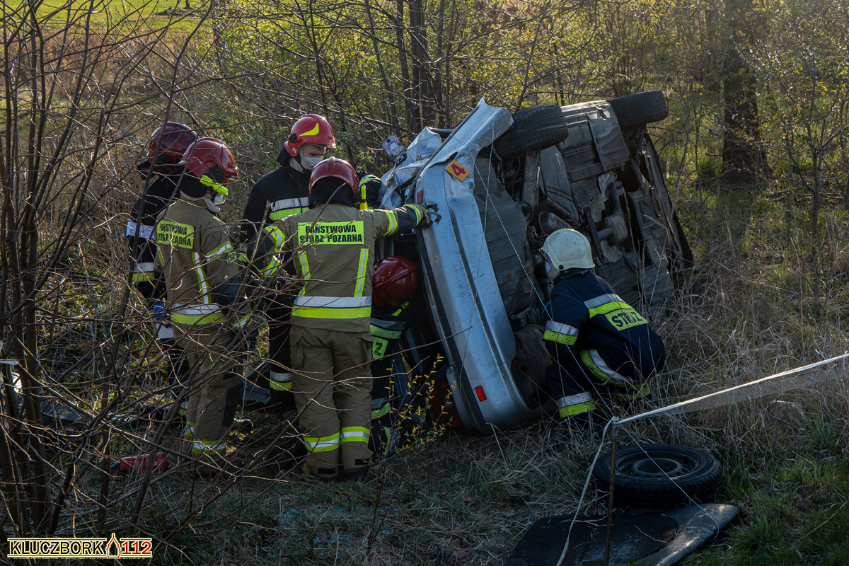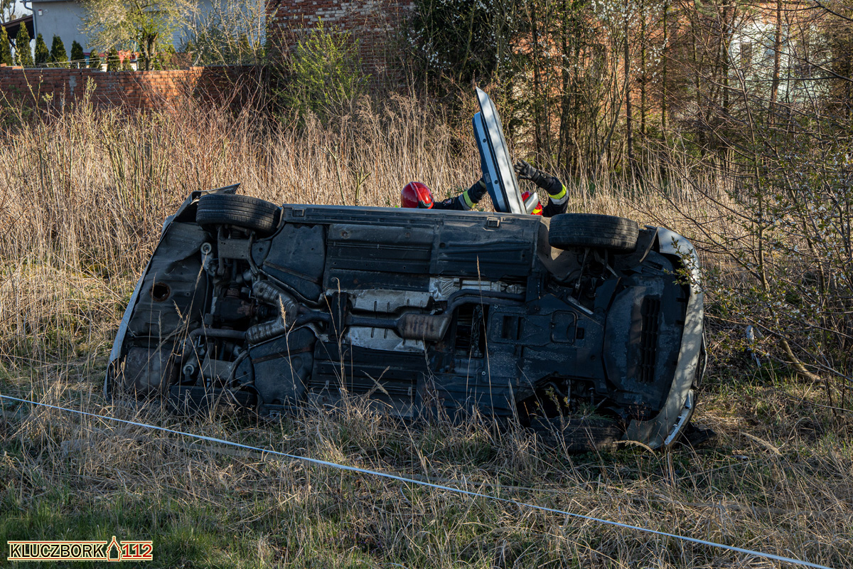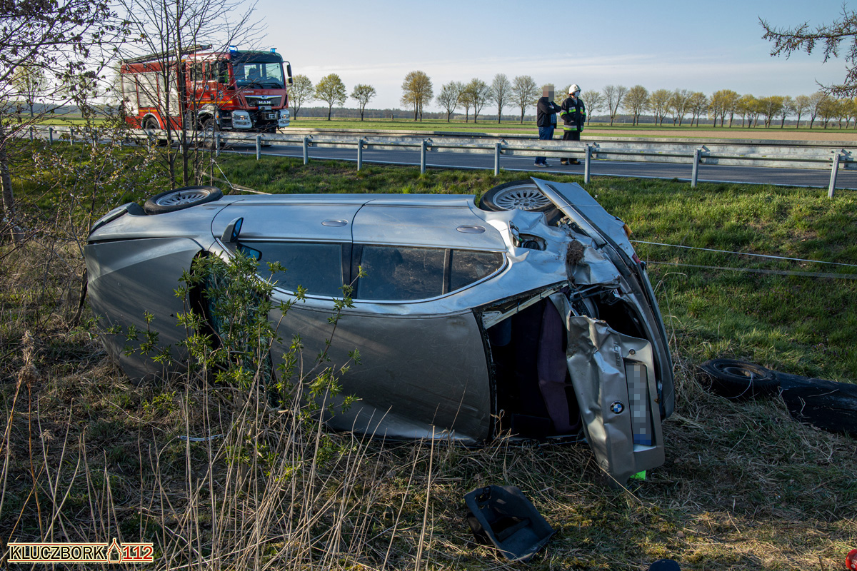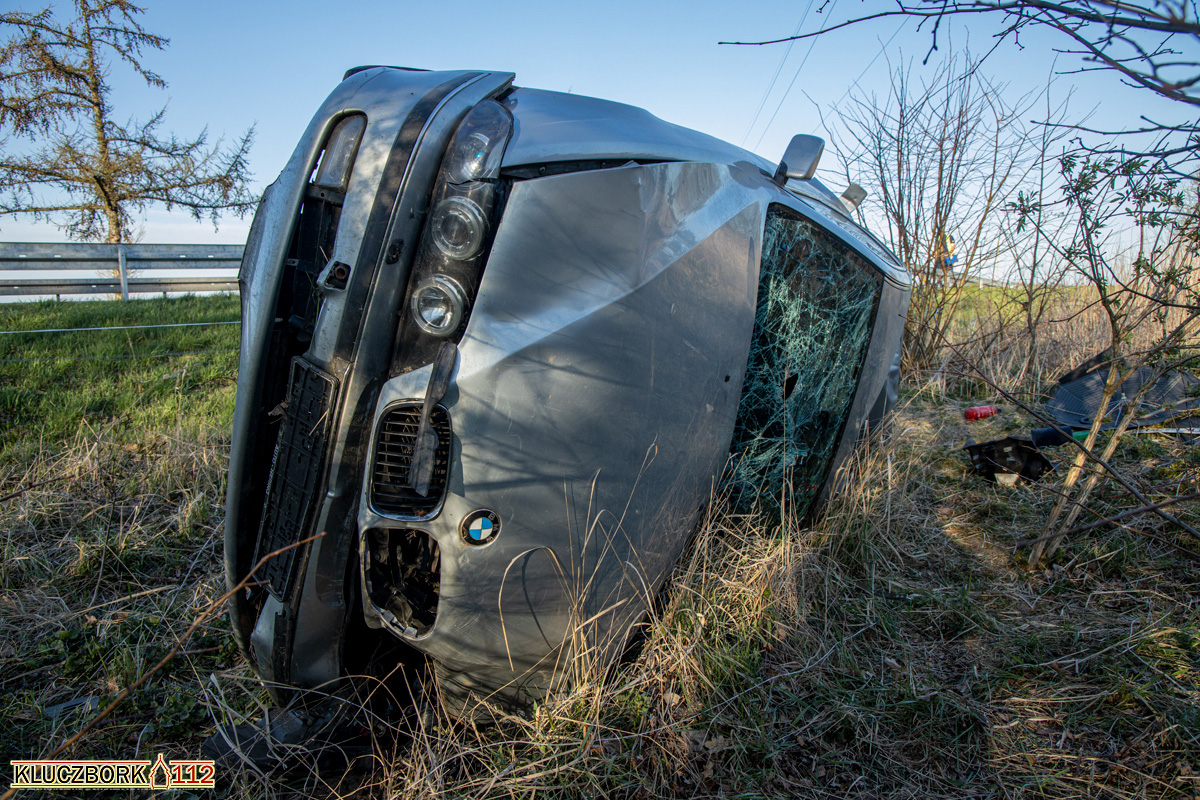 Bo dojeździe na miejsce strażacy zastali auto osobowy marki BMW leżące na boku w rowie.